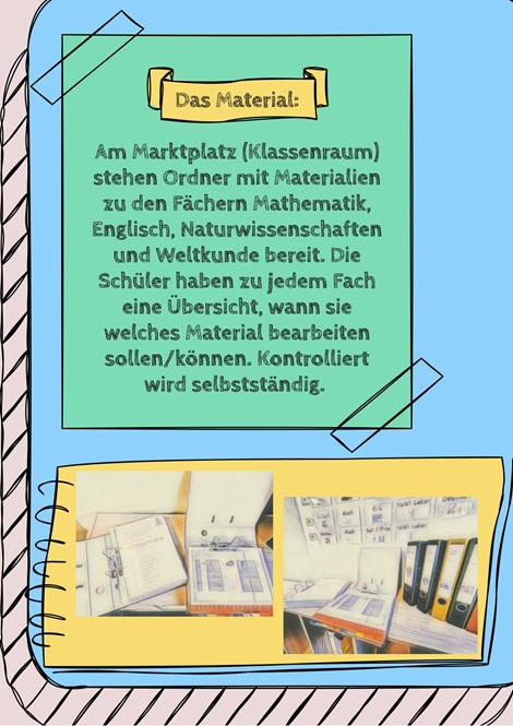 Der Marktplatz findet täglich von Stunde 2 bis Stunde 4 statt. Hier arbeiten die Schülerinnen entweder im Klassenraum (Marktplatz) oder gehen in die Vorlesungen. Die SchülerInnen entscheiden selbst an welchen Fächern sie arbeiten wollen oder müssen.Das differenzierte Material liegt in Ordnern im Klassenraum bereit. Um den Überblick zu behalten, bekommen die SchülerInnen zu Beginn jeder Einheit einen sogenannten Baustein-Plan. Hier steht ganz genau, welche Materialien wann bearbeitet werden müssen.