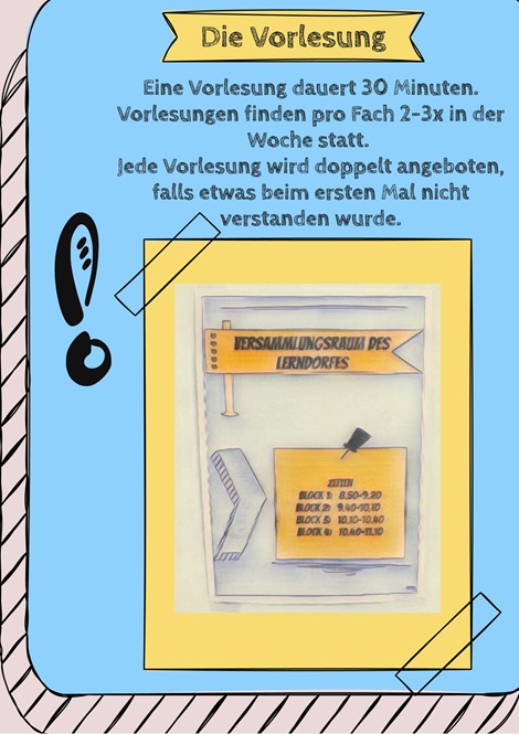 In den sogenannten Vorlesungen werden gemeinsam neue Fachinhalte erschlossen. Das ähnelt dem "normalen Frontalunterricht". Die Vorlesungen sind aber lediglich 30 Minuten lang. Hierfür verlassen die SchülerInnen den Klassenraum und gehen in den Vorlesungsraum. Hier mischen sich die Lerndorfklassen. Zu Beginn von Klasse 5 legen die Klassenlehrkräfte noch fest, wer wann in die Vorlesungen geht. Nach und nach entscheiden die SchülerInnen das dann eigenverantwortlich. Zur Kontrolle müssen sie diese Besuche im Logbuch planen und vermerken. Dafür haben sie zu Beginn eines jeden Tages 10 Minuten Planungszeit.