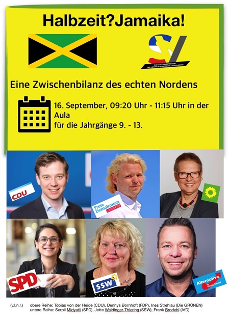 GRÜNEN), Frau Serpil Midaylti (MdL, SPD), Frau Jette Waldinger-Thiering (MdL, SSW) und Herrn Frank Brodehl (MdL, AfD) in der Aula der Heinrich-Heine-Gemeinschaftsschule anlässlich der „Halbzeit“ der Landesregierung Daniel Günther Kabinett I „Jamaika“ in Schleswig-Holstein, welche seit 2017 regiert. Die Mittelstufe bis Oberstufe wird dabei die Chance bekommen, unsere Landespolitik mit Fragen zu durchlöchern und Persönliches unserer Abgeordneten kennenzulernen. Die Veranstaltung wird durch Elias Arp moderiert.