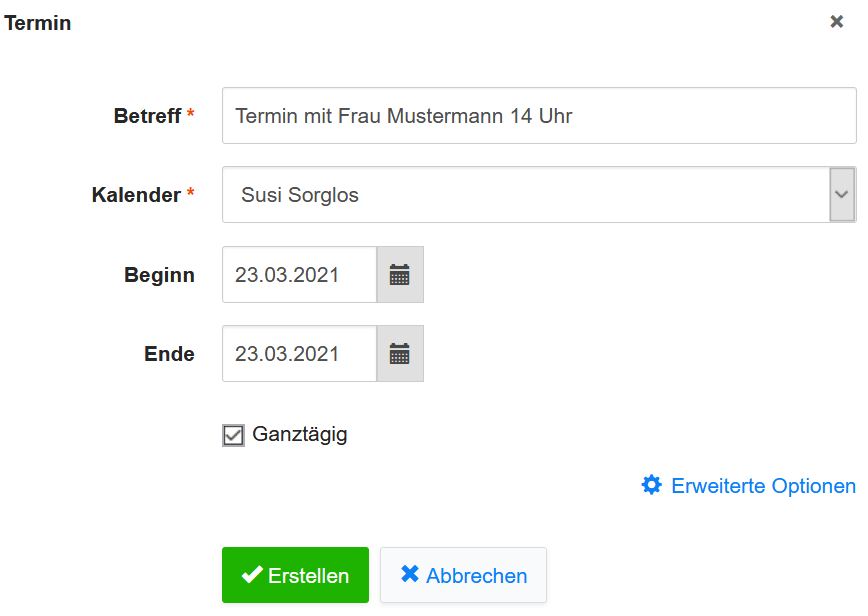 Zum Schluss drückst du nur noch auf „Erstellen“ und dir wird dein Termin im Kalender angezeigt.