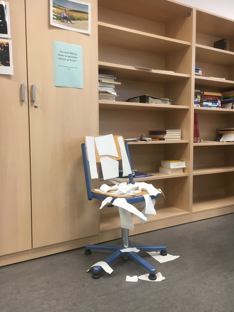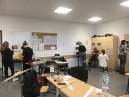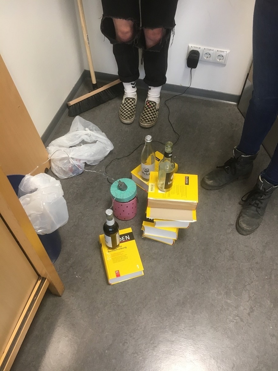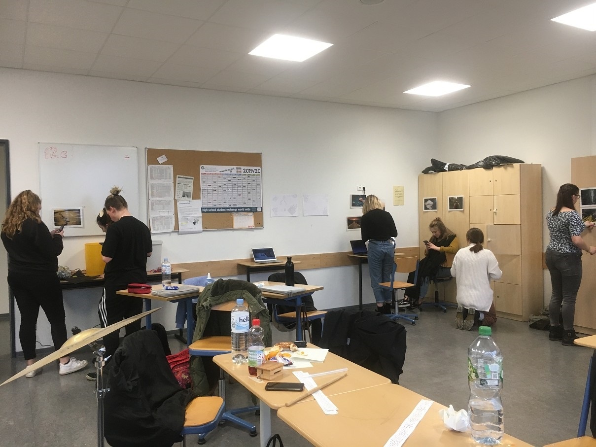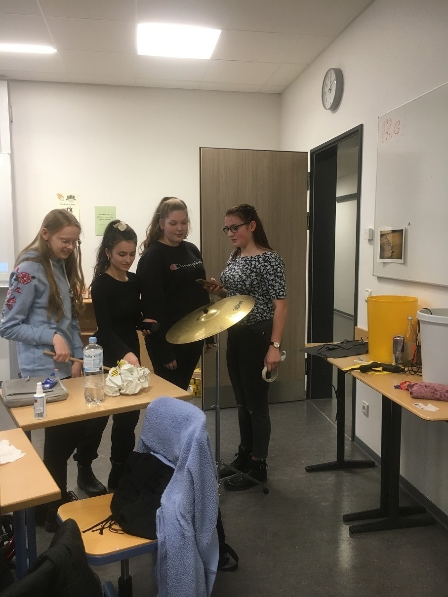 Klänge, Geräusche und akustische Phänomene standen am 21. und 22. November im Mittelpunkt des Unterrichts der 12c (ästhetisches Profil). Hintergrund war die Teilnahme an einen Workshop des Klangkünstlers Heiko Wommelsdorf im Rahmen des Projektes „Kunst hoch Schule“. In den zwei Tagen gingen die Schülerinnen und Schüler unterschiedlichen Fragen nach z. B. Was ist Klangkunst? Was ist Musik? Was ist keine Musik? Was ist laut? Was ist leise? Welche Geräusche begegnen mir im Alltag? Was ist mein Lieblingsgeräusch?… Nachdem unterschiedliche Geräusche in der Schule gesammelt wurden, wurden diese in einen neuen Kontext gestellt und im Klassenraum positioniert. So entstand ein vielfältiges und ungewöhnliches Gesamtwerk. Beispielsweise wurde eine Mikrowelle nachgebaut und mit einer Fahrradklingel kombiniert. Abschließend ist zu sagen, dass die Klasse einen vielfältigen Einblick in die Klangkunst bekommen hat, ihr Gehör sensibilisiert wurde und der experimentelle, spielerische Umgang mit Geräuschen viel Spaß gemacht hat.