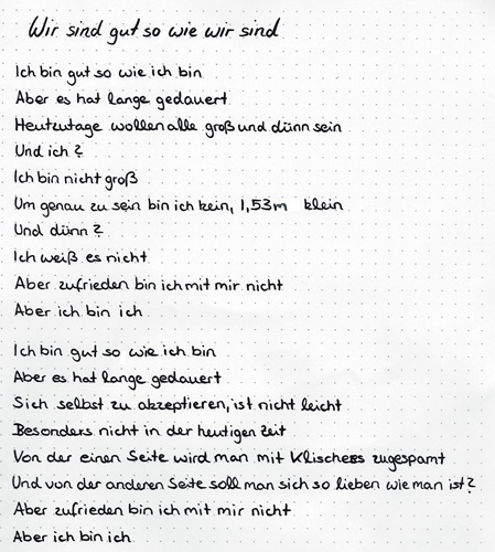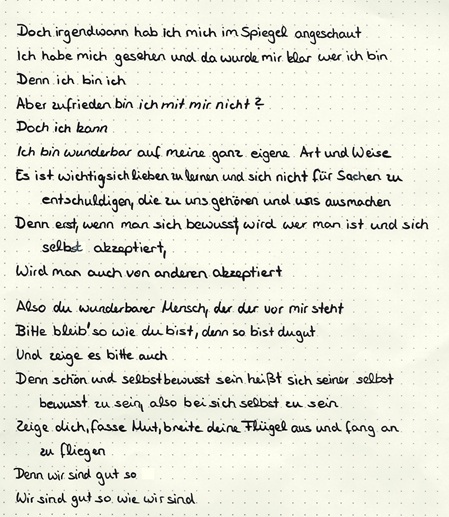 Bei der Entlassfeier hast du als Abschlussschülerin deines Jahrgangs ein selbst verfasstes Poetry-Slam vorgetragen. Das hat uns alle sehr berührt. Damit deine Zeilen viel mehr Leute lesen, sich daran erfreuen oder daraus lernen können, sind sie ab jetzt hier zu finden.