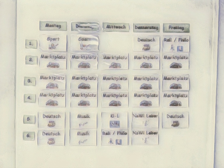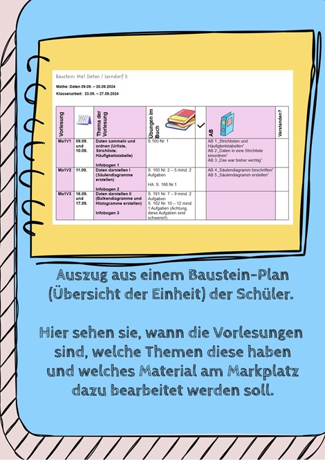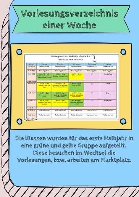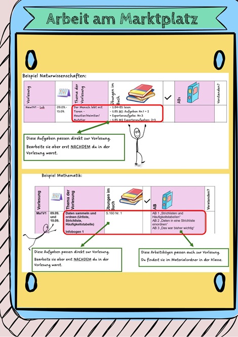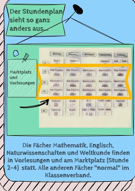 Der Marktplatz findet täglich von Stunde 2 bis Stunde 4 statt. Hier arbeiten die Schülerinnen entweder im Klassenraum (Marktplatz) oder gehen in die Vorlesungen. Die SchülerInnen entscheiden selbst an welchen Fächern sie arbeiten wollen oder müssen.Das differenzierte Material liegt in Ordnern im Klassenraum bereit. Um den Überblick zu behalten, bekommen die SchülerInnen zu Beginn jeder Einheit einen sogenannten Baustein-Plan. Hier steht ganz genau, welche Materialien wann bearbeitet werden müssen.