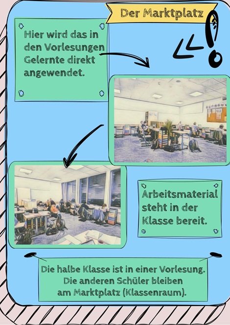 - In den 30-minütigen Vorlesungen bekommen die SchülerInnen neue Fachinhalte erklärt. Das Gelernte sollen sie dann anschließend in den Marktplatzstunden anwenden, üben und vertiefen.