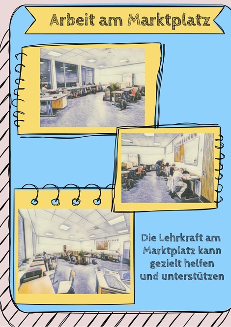 - Am Markplatz achten die Lehrkräfte auf eine ruhige und angenehme Arbeitsatmosphäre. Die SchülerInnen können eigenverantwortlich entscheiden, welches Fach sie bearbeiten wollen. So können die SchülerInnen in ihrem eigenen Tempo und auf dem selbst gewählten Niveau arbeiten.