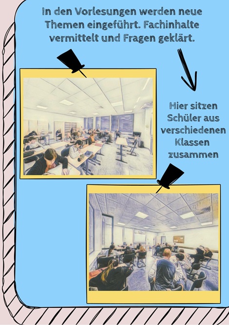 - Die Vorlesungen werden in der Regel doppelt angeboten. So können die SchülerInnen den Input doppelt erhalten wenn nötig.